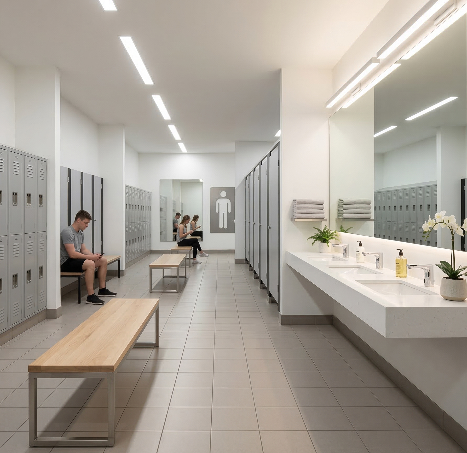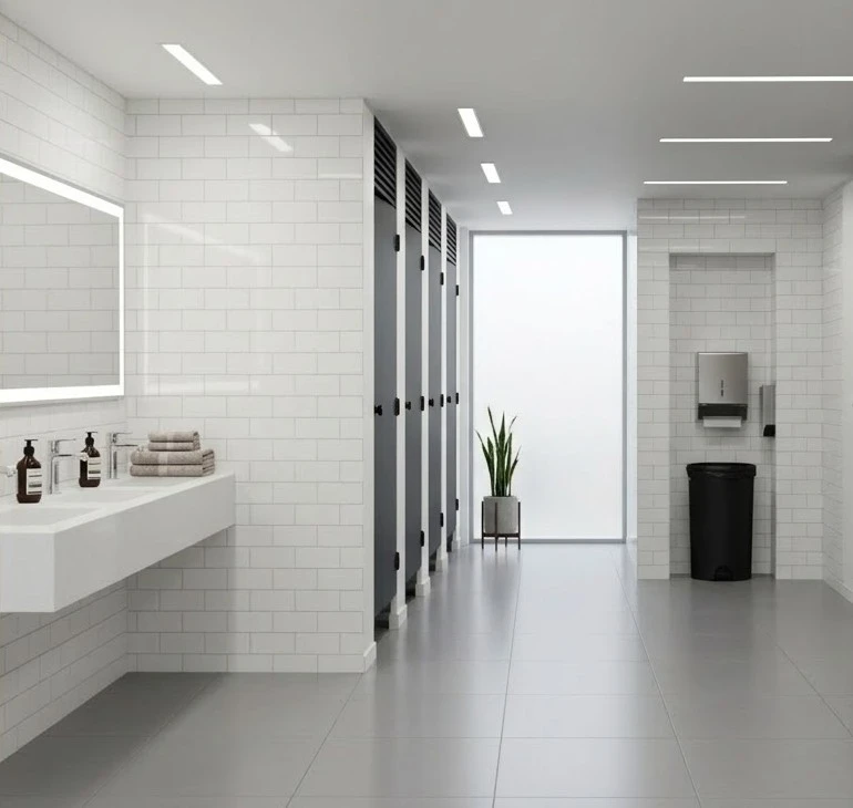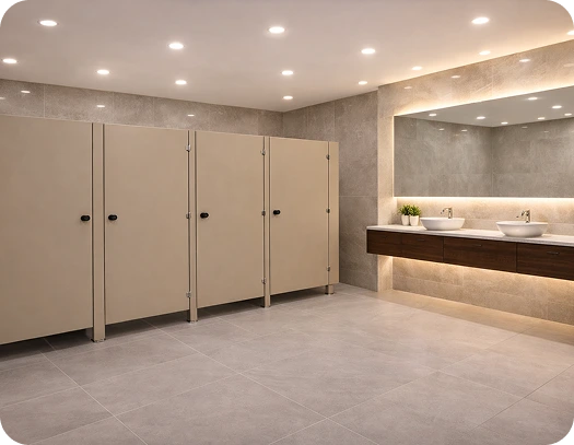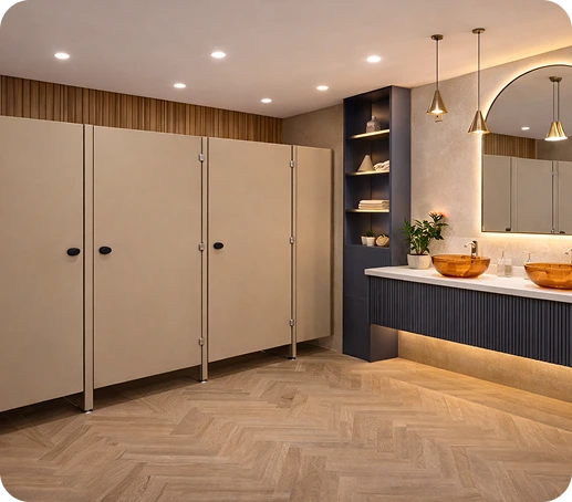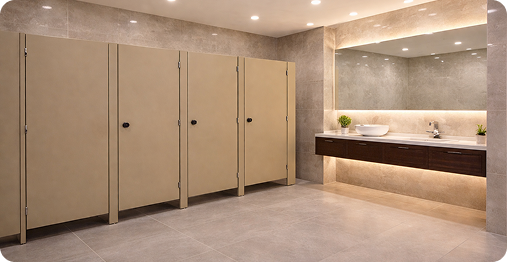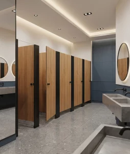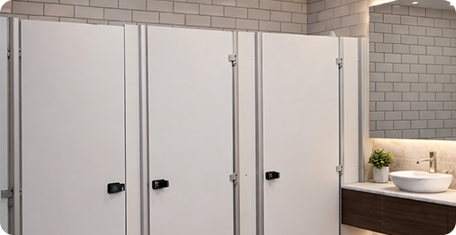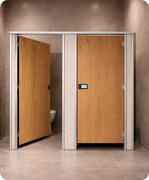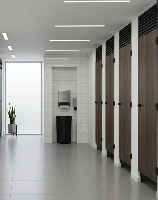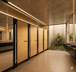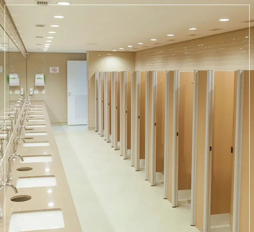 Com um visual moderno e elegante, o modelo foi desenvolvido para compor ambientes com alto nível estético, como shoppings, aeroportos, edifícios corporativos e espaços premium. Sua estrutura robusta é combinada com chapas de alta pressão (HPL), garantindo resistência superior à umidade, impactos e ao uso intenso do dia a dia.