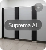 A linha Suprema AL retorna com o perfil superior aparente e com os laminados de 10 mm. O modelo Suprema AL é travado com tubo alumínio superior e batentes no laminado TS + acessórios em aço inox. O sistema é disponível também com rodapé em alumínio. O painel de 10 mm é o padrão, podendo ser utilizado 12 mm nas frontais e 8 mm nas portas e divisões internas.